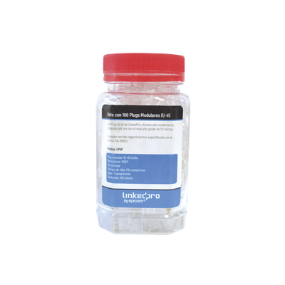 LinkedPRO LP-5P. Conector: RJ-45, Color del producto: Transparente, Cable estándar: Cat5e. Ancho: 11.7 mm, Profundidad: 22.8 mm, Altura: 8.4 mm. Cantidad por paquete: 100 pieza(s). Tipo de empaque: Tarro de plástico