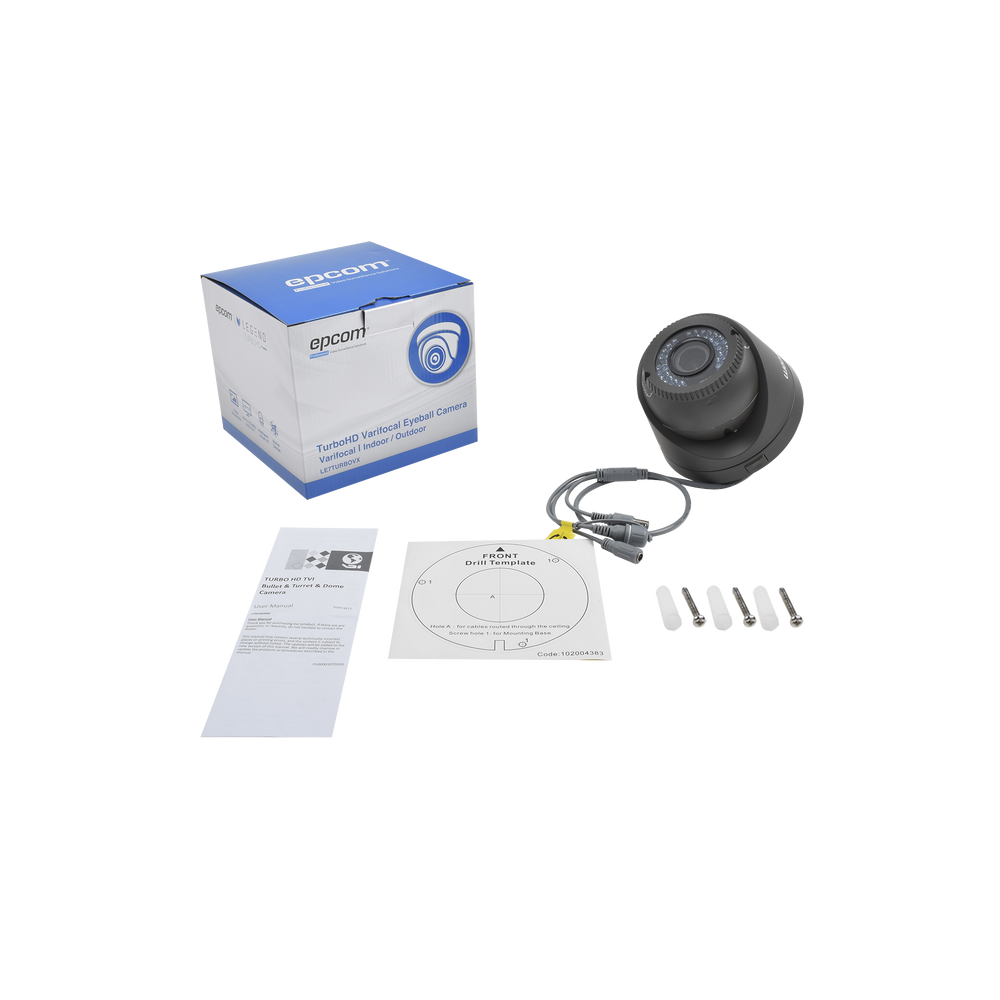 Caracteristicas: Sensor CMOS 1MP epcom® TurboHD (Scan progresivo). Resolución Máxima: 720p (1280 x 720). Lente: 2.8 - 12 mm. Día / Noche real (Filtro ICR). Iluminación mínima: 0.1 Lux@ (F1.