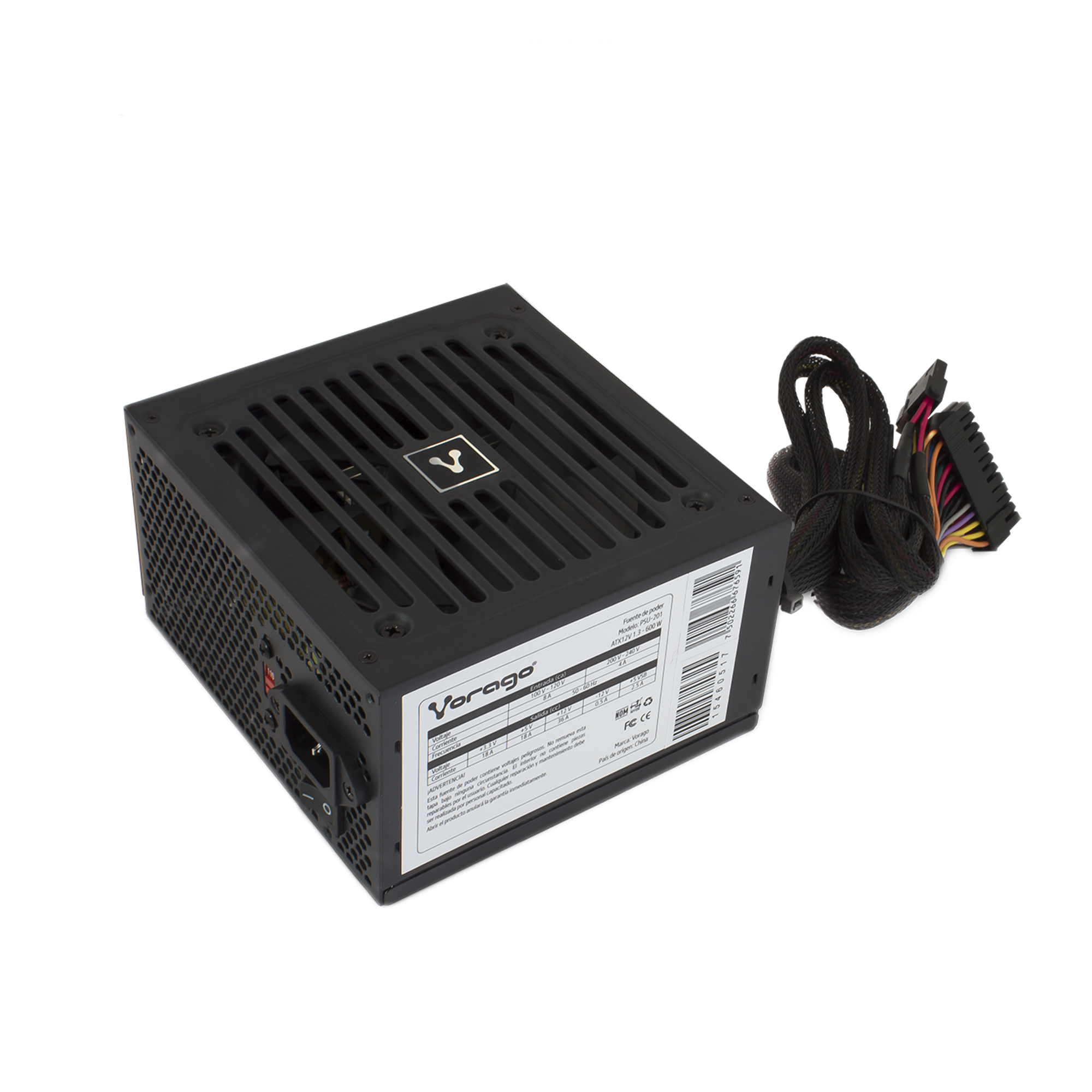 Vorago PSU-201. Potencia total: 600 W, Voltaje de entrada AC: 110 - 240, Frecuencia de entrada AC: 50 - 60. Número de ventiladores: 1 Ventilador(es), Ubicación de ventilador: Superior. Alimentador de energía para tarjeta madre: 20+4 pin ATX, Motherboard power cable length: 32 cm, CPU power cable length: 32 cm. Factor de forma: ATX, Utilizar con: PC. Color del producto: Negro, Iluminación de color: Azul