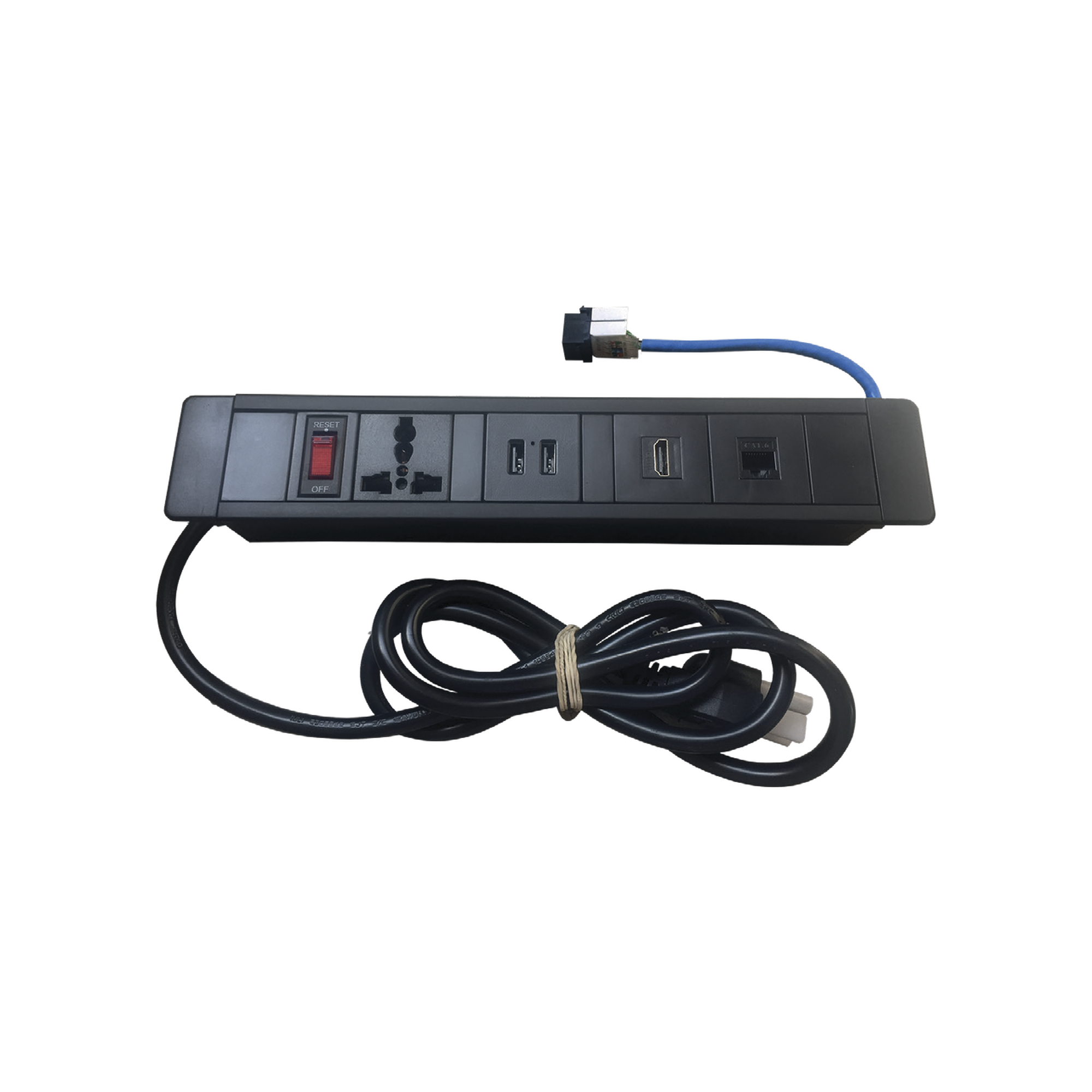 Hub para escritorio color negro, con 1 Puerto HDMI Hembra-Hembra, 1 Conector RJ45 Cat6, 2 Puertos USB 5V DC /2 A, y 1 Contacto eléctrico universal THMC-HUB