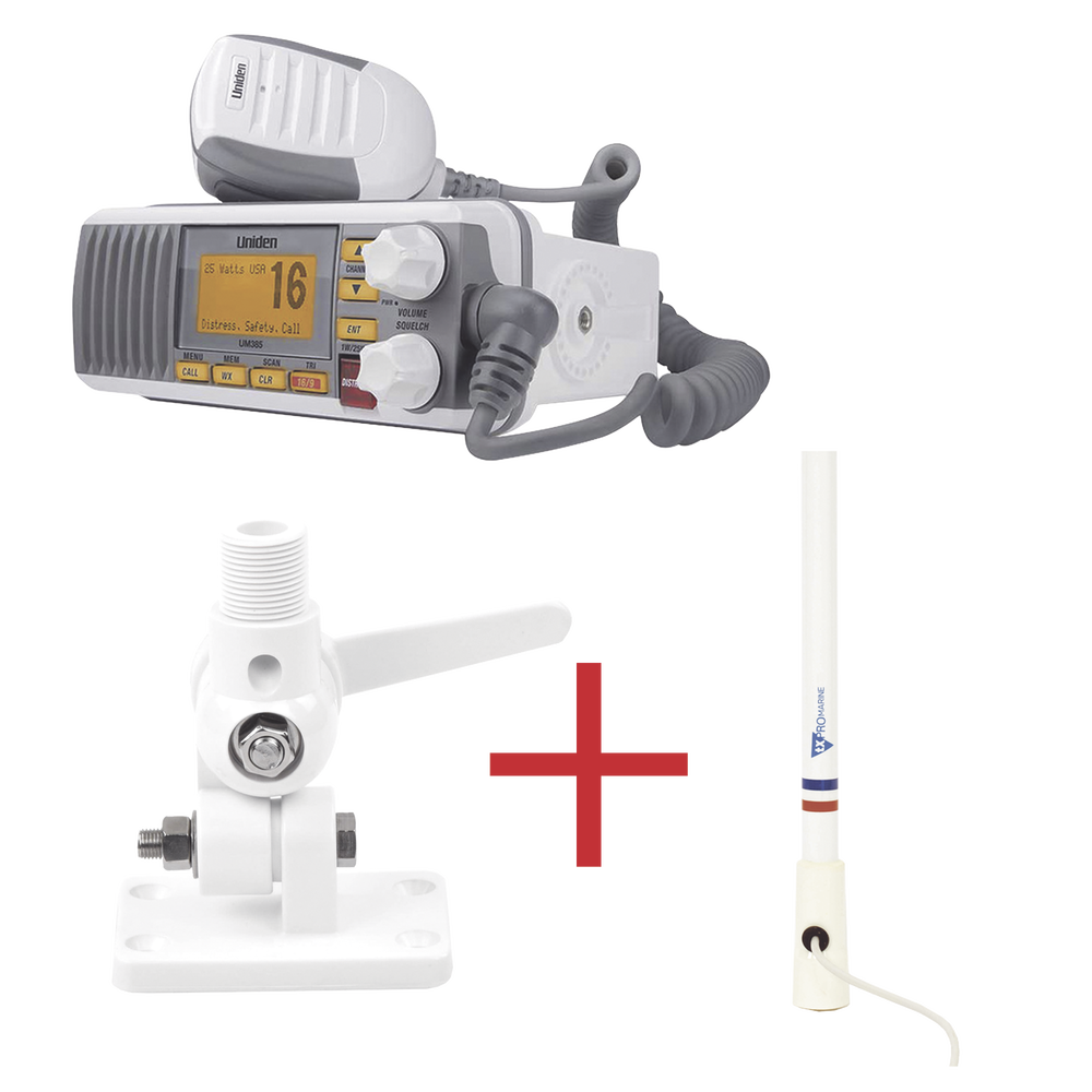 Kit de radio marino Uniden UM385, más antena marina de fibra de vidrio TX-5206-SYS y soporte para antena 4186 UM385/KIT5206