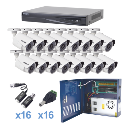 Sistema TURBOHD 1080P H.265+ Incluye DVR 16 ch / 16 cámaras bala (interior - exterior, 2.8mm gran angular) / transceptores / conectores / Fuente de poder profesional Heavy Duty 20A, Hasta 15Vcd para Larga Distancia KEVTX8T16BW