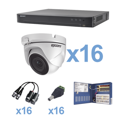 Sistema TurboHD Epcom KEVTX8T16EW, 1080P, H.265+ Incluye DVR 16ch / 16 cámaras eyeball (Interior/Exterior 2.8mm gran angular) transceptores / conectores / Fuente de poder profesional Heavy Duty 20A, Hasta 15Vcd para Larga Distancia.