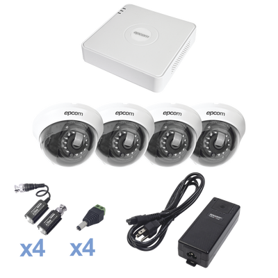 Sistema TURBOHD 720p / DVR 4 Canales / 4 cámaras Domo (interior 2.8 mm) / Transceptores / Conectores / Fuente de Poder Profesional KESTXLT4DW