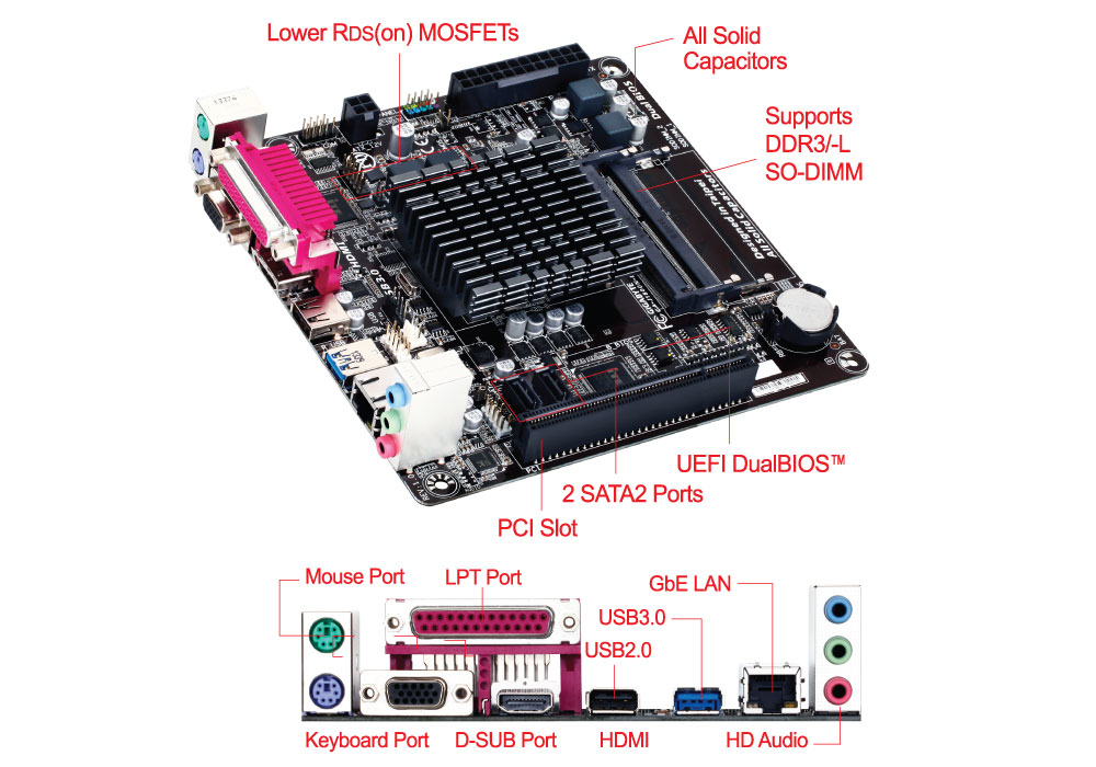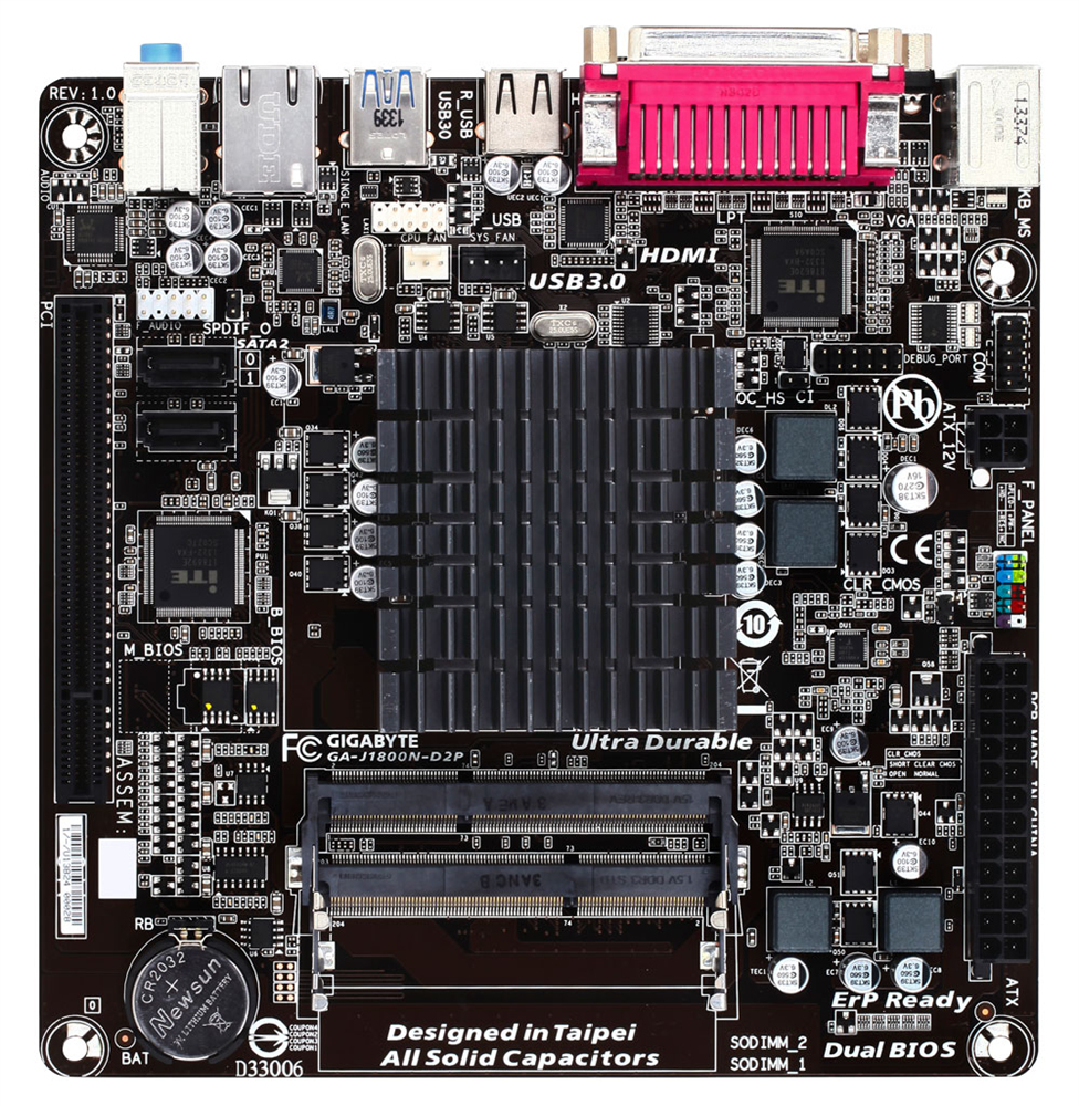 Gigabyte GA-J1800N-D2P. tipos de memoria compatibles: DDR3-SDRAM, Tipo de ranuras de memoria: SO-DIMM, Canales de memoria: Dual. Familia de procesador: Intel, Socket de procesador: NA (CPU integrada), Procesador incorporado: Celeron J1800. Interfaces de unidad de disco duro soportadas: SATA, Serial ATA II. Tipo de interfaz ethernet: Gigabit. Componente para: PC, Familia de componentes de tarjeta madre: Intel, Tarjeta madre, factor de forma: Mini iTX