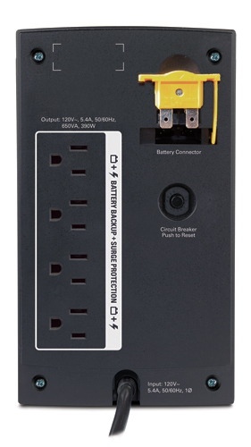 APC Back-UPS 650VA. Capacidad de potencia de salida (VA): 650 VA, Potencia de salida: 390 W, Voltaje de entrada de operación (min): 82 V. Tipo de salida AC: NEMA 5–15R, Longitud de cable: 1.2 m. Tiempo de recarga de la batería: 8 h. Factor de forma: Torre, Color del producto: Negro. Nivel de ruido: 45 Db