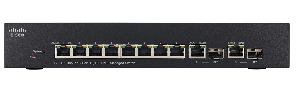 Cisco SF302-08MPP, Small Business. Tipo de interruptor: Gestionado, Capa del interruptor: L3. Puertos tipo básico de conmutación RJ-45 Ethernet: Fast Ethernet (10/100), Puerto de consola: RJ-45. Estándares de red: IEEE 802.1ab, IEEE 802.1D, IEEE 802.1p, IEEE 802.1Q, IEEE 802.1s, IEEE 802.1w, IEEE 802.1x, IEEE 802. Tabla de direcciones MAC: 16384 entradas, Capacidad de conmutación: 5.6 Gbit/s, Rendimiento: 4.17 Mpps. Algoritmos de seguridad soportados: 802.1x RADIUS, SSH, SSH-2, SSL/TLS