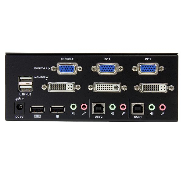 Con soporte para interfaces de video de alta resolución, el versátil conmutador KVM para doble monitor ofrece 1 puerto VGA (análogo) y 1 puerto DVI-I por conexión de PC, así como capacidad de cambio de audio entre las computadoras conectadas.