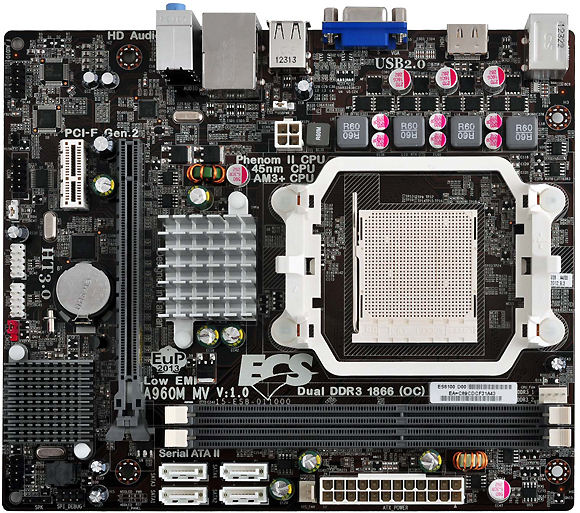 ECS A960M-MV (V1.0A). tipos de memoria compatibles: DDR3-SDRAM, Tipo de ranuras de memoria: DIMM, Canales de memoria: Dual. Familia de procesador: AMD, Procesador compatible: Athlon FX, Athlon II, Phenom II Dual-Core Mobile, Sempron, Socket de procesador: Socket AM3+. USB 2.0, conectores: 2 Texto, Conectores USB 3.0: 0 Texto, Interfaces de unidad de disco duro soportadas: Serial ATA II. Cantidad de puertos USB 2.0: 4 Texto, Cantidad de puertos USB 3.0: 0 Texto, Ethernet LAN (RJ-45) cantidad de puertos: 1 Texto. Tipo de interfaz ethernet: Rápido